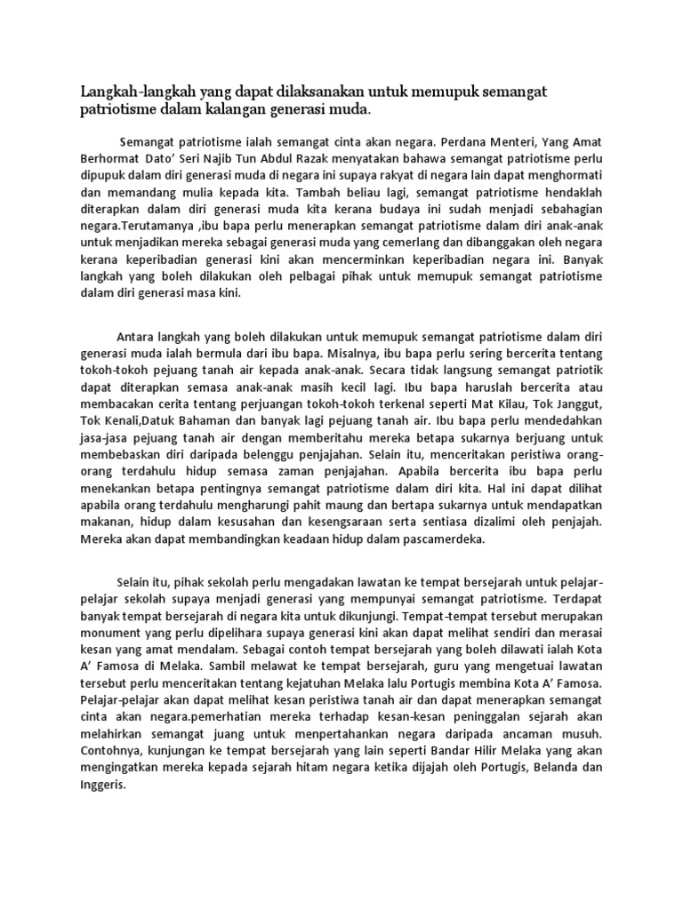 Isu yang mencetuskan polemik dalam kalangan media massa saban hari ini pantas meniti dari bibir ke. Langkah pemupukan semangat patriotisme 1. Semangat patriotisme juga dapat memupuk perpaduan kaum. Hal ini berlaku demikian kerana. Cara cara untuk memupuk semangat patriotisme. Hal ini berlaku demikian kerana. Hal ini demikian berpunca daripada pelbagai faktor dan suasana kehidupan yang lebih terbuka dan mencabar. Langkah memupuk semangat patriotik patriosme dalam kalangan generasi muda. Sesungguhnya, semangat patriotisme akan membentuk rakyat yang lebih mementingkan kepentingan negara daripada kepentingan kaum. Kempen berterusan dan efektif daripada kerajaan dan badan swasta 3. Isu yang mencetuskan polemik dalam kalangan media massa saban hari ini pantas meniti dari bibir ke bibir. Perkara ini membolehkan semangat patriotik sebati dalam diri pelajar seperti kata peribahasa melayu. Sebenarnya terdapat banyak cara yang boleh dijalankan untuk meningkatkan semangat patriotik dalam kalangan masyarakat di negara kita.